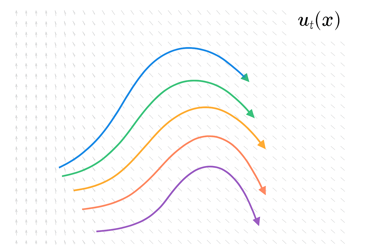 - Vector field \(u_t(x)\): The current at each point — it tells a particle “if you’re here, move in this direction”