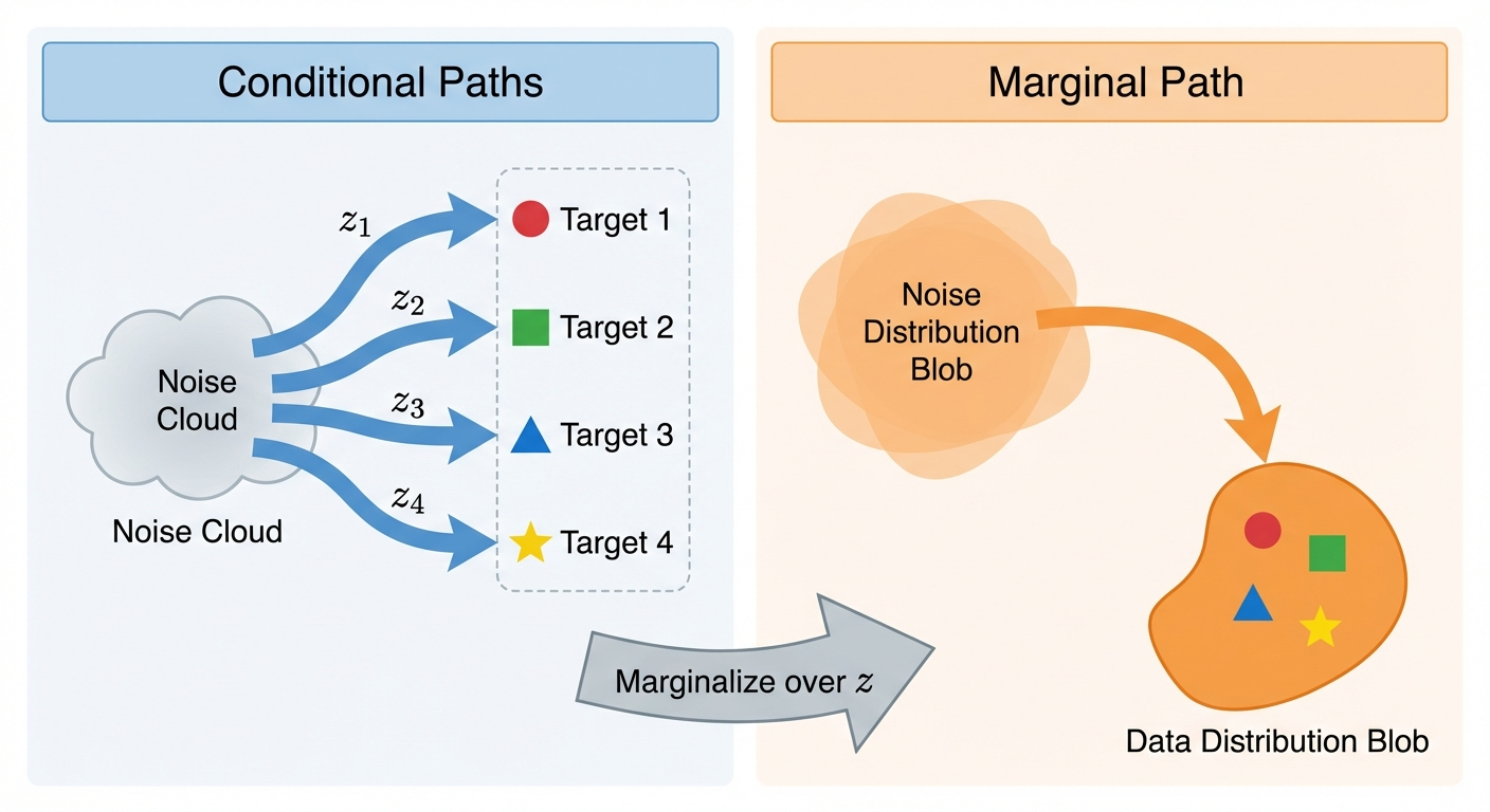 In the next post, we’ll see how the marginalization trick solves this problem, allowing us to train on conditional targets while learning a marginal vector field that works without knowing \(z\).