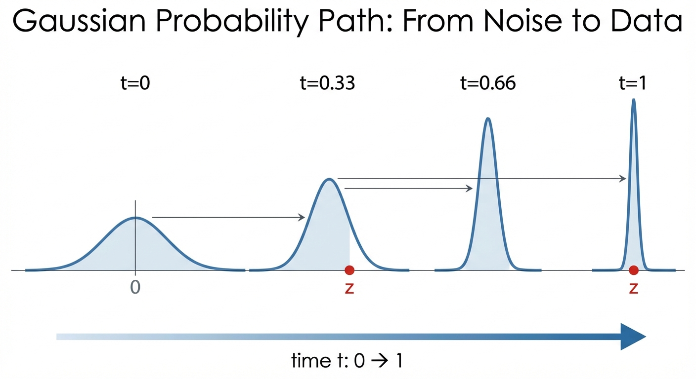 The abstract definition is nice, but what does a probability path actually look like? The most common choice is a Gaussian probability path, where each \(p_t(x|z)\) is a Gaussian whose mean drifts toward \(z\) and whose variance shrinks over time.
