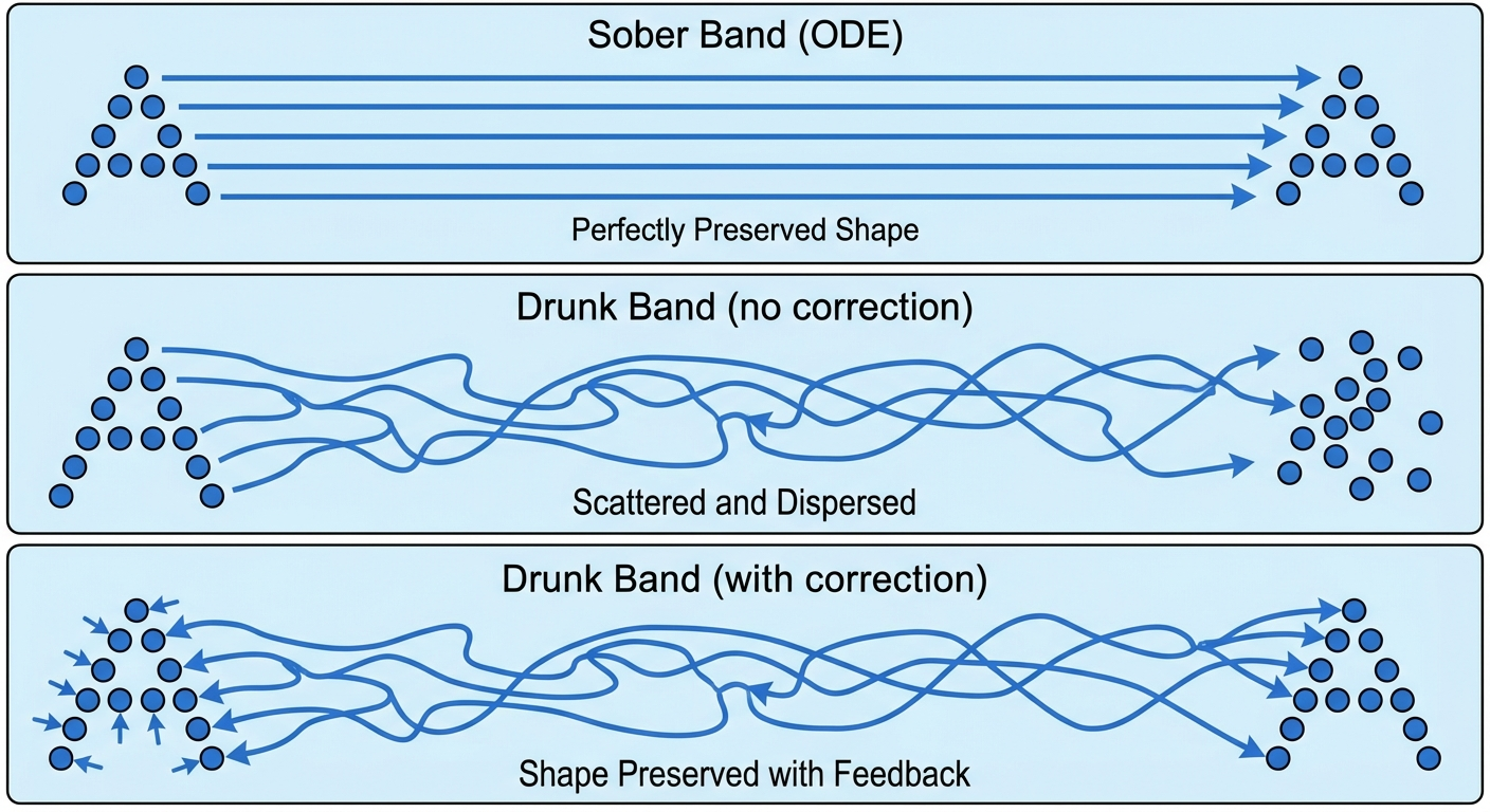 The correction term \(\frac{\sigma_t^2}{2} \nabla \log p_t\) points toward high-probability regions, counteracting the dispersion from noise (the “drunken marching band” needs to aim inward to maintain formation).
