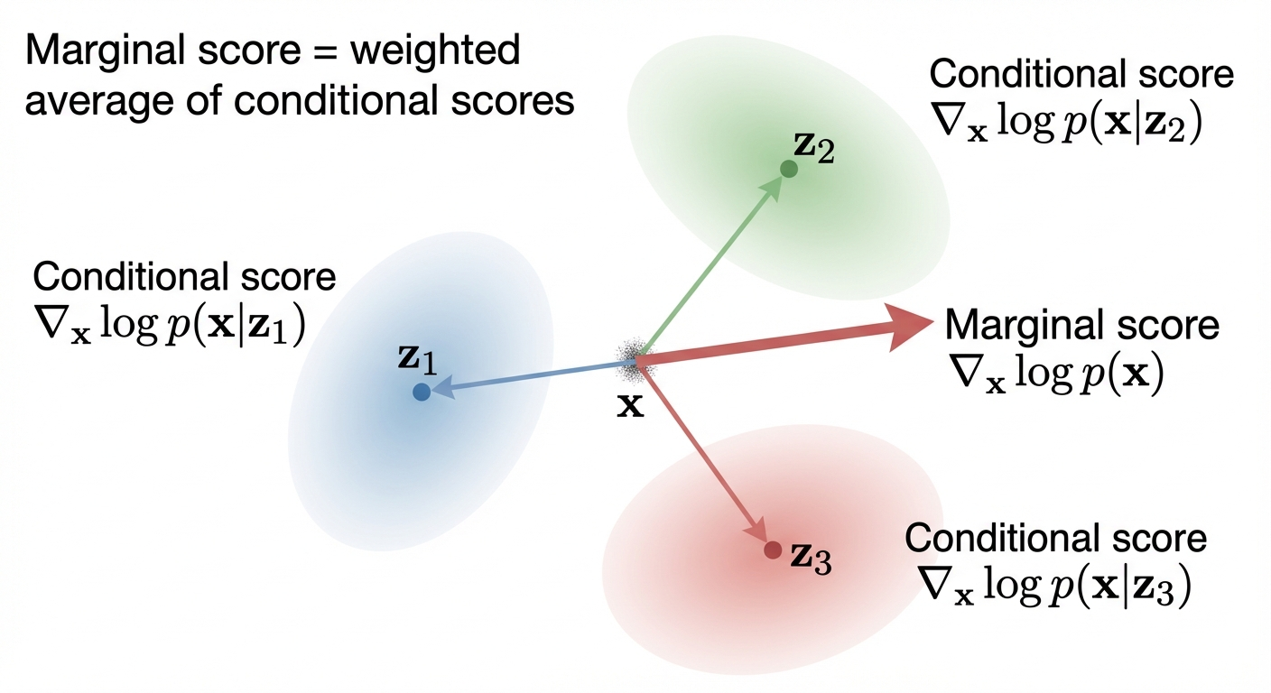 For training, we showed that the marginal score equals an expectation of conditional scores: \[ \nabla \log p_t(x) = \mathbb{E}_{z \sim p(z|x,t)}[\nabla \log p_t(x|z)] \]