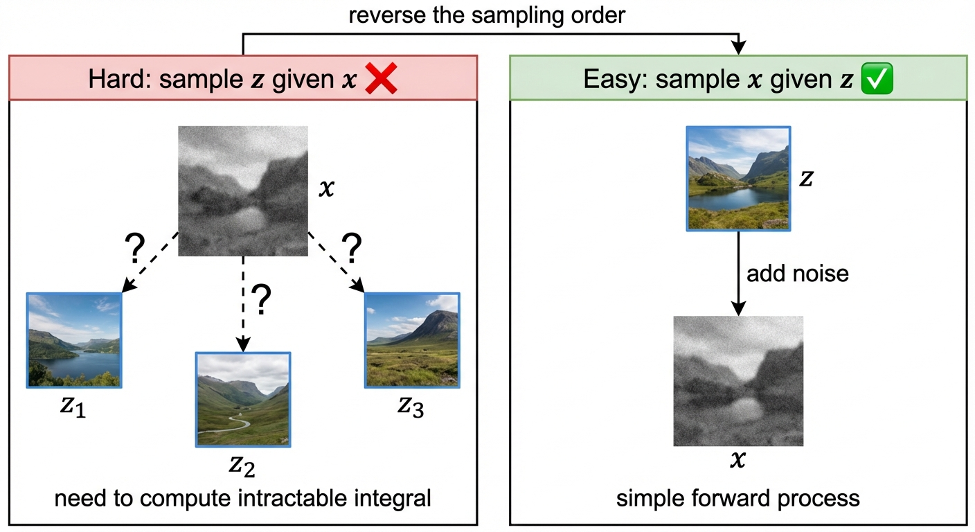 Intuitively: for a given \(x\), different \(z\)’s could have produced it. The network learns to average over all possible \(z\)’s, weighted by how likely each \(z\) was to produce this \(x\) — which is exactly the posterior \(p(z|x,t)\).