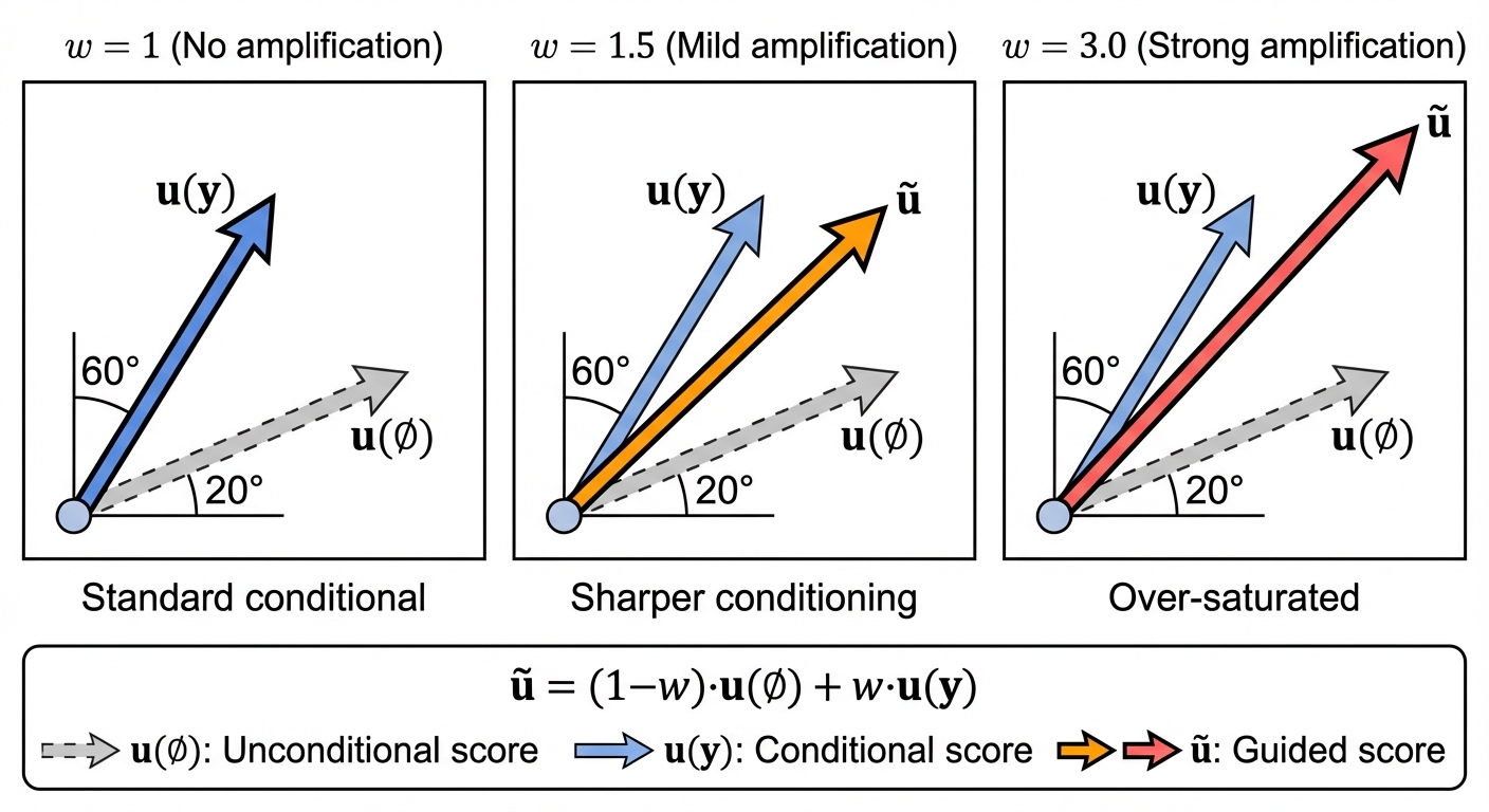 - \(w = 1\): No amplification (standard conditional generation)