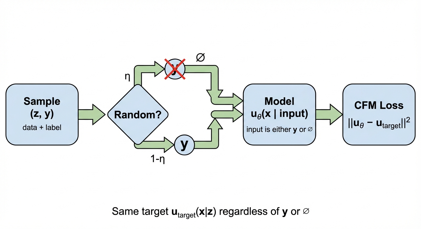 | Training | Random label dropout with probability \(\eta\) | Standard CFM loss |