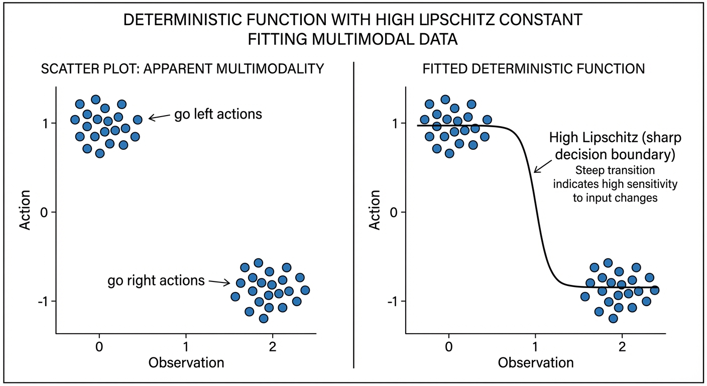 Consider a T-intersection where the robot could go left or right. This seems multimodal — two valid actions for similar observations. But a deterministic policy with high Lipschitz constant can fit this perfectly: slightly left of the decision boundary → go left; slightly right → go right. The transition is nearly vertical — a tiny change in observation causes a large change in action.