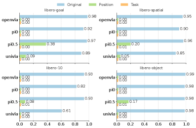 - LIBERO-Plus\(^{[3]}\): Systematic testing across 7 robustness dimensions reveals models ignore language instructions entirely