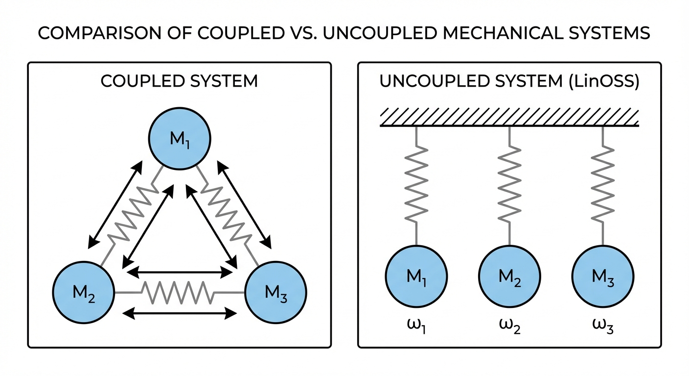 LinOSS takes a different approach: instead of engineering eigenvalue constraints, they start from physics. Forced harmonic oscillators (the equations governing springs, pendulums, and countless physical systems) naturally produce the oscillatory dynamics we need.