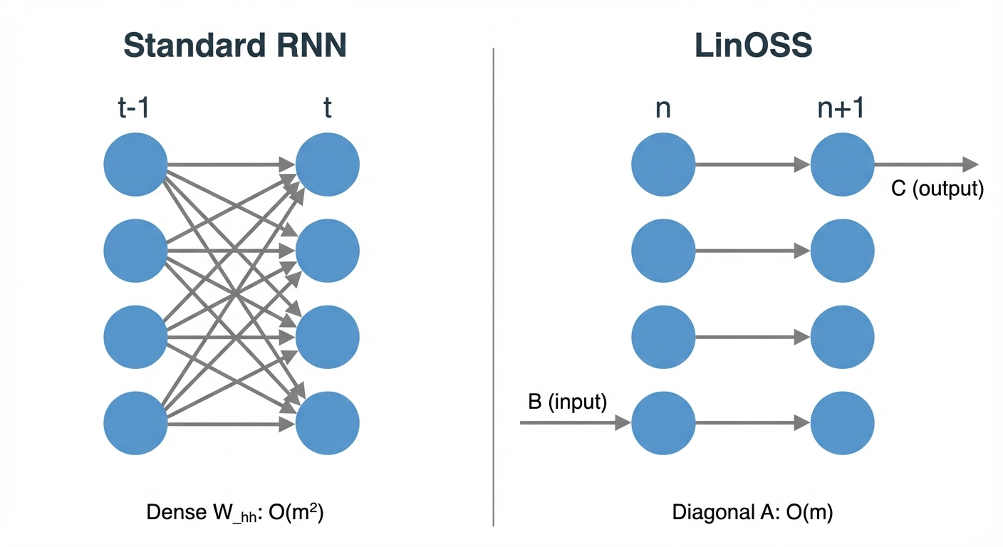The theoretical foundation arrived in 2023 with “Neural Oscillators are Universal” (NeurIPS). This paper proved that forced harmonic oscillators with a nonlinear readout layer can approximate any continuous function. The key realization: if nonlinearity only happens between oscillator blocks (in the readout), the oscillator core can stay entirely linear. Linear means the recurrence has a closed form. Closed form means parallel scan. That’s LinOSS.