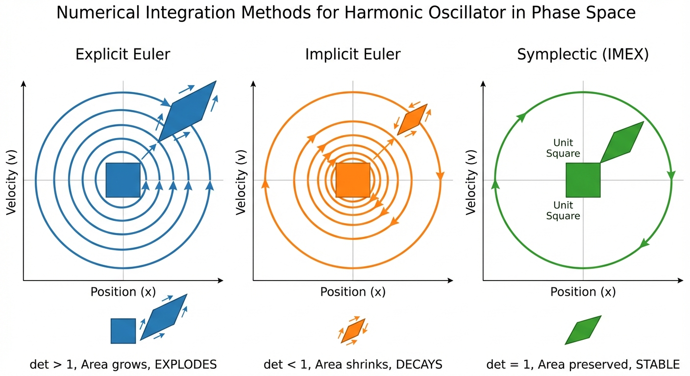 Symplectic discretization maps purely imaginary continuous eigenvalues (\(\lambda = i\omega\)) to the unit circle in discrete time (\(|\lambda| = 1\)). The stability guarantee transfers automatically. Naive methods (Euler’s method) break this property; symplectic integrators preserve it by design.