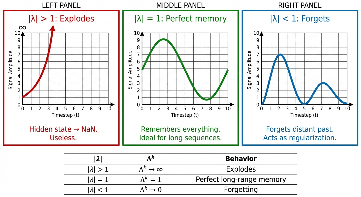 State Space Models (S4, Mamba, LRU) exploit this insight by parameterizing eigenvalues directly. But they still require careful initialization and constraints to maintain stability. On very long sequences, small numerical errors compound over thousands of steps.