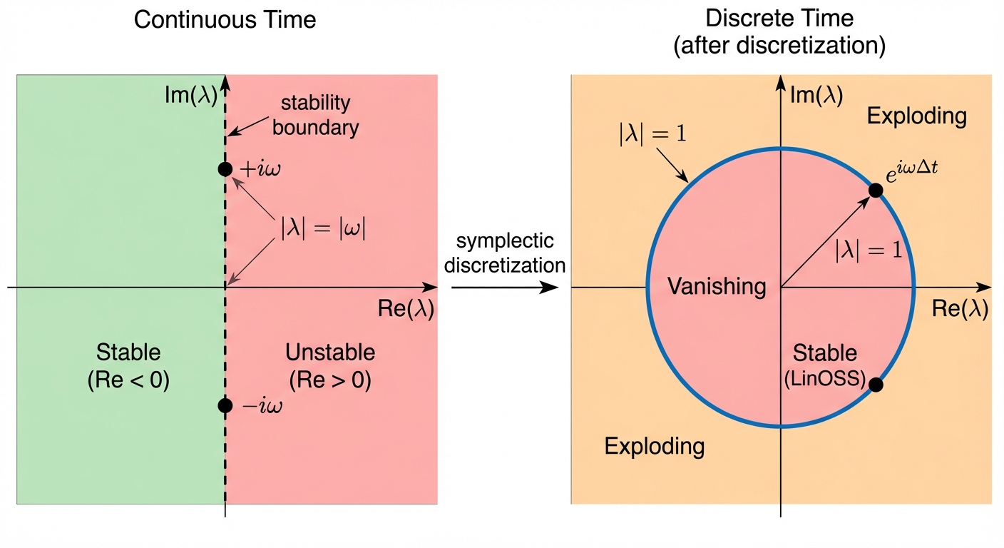 In continuous systems, stability is determined by the real part of eigenvalues. If the real part is zero, amplitude stays constant; positive means explosion, negative means decay. LinOSS starts from continuous-time physics, where this property is easier to guarantee than in discrete systems.