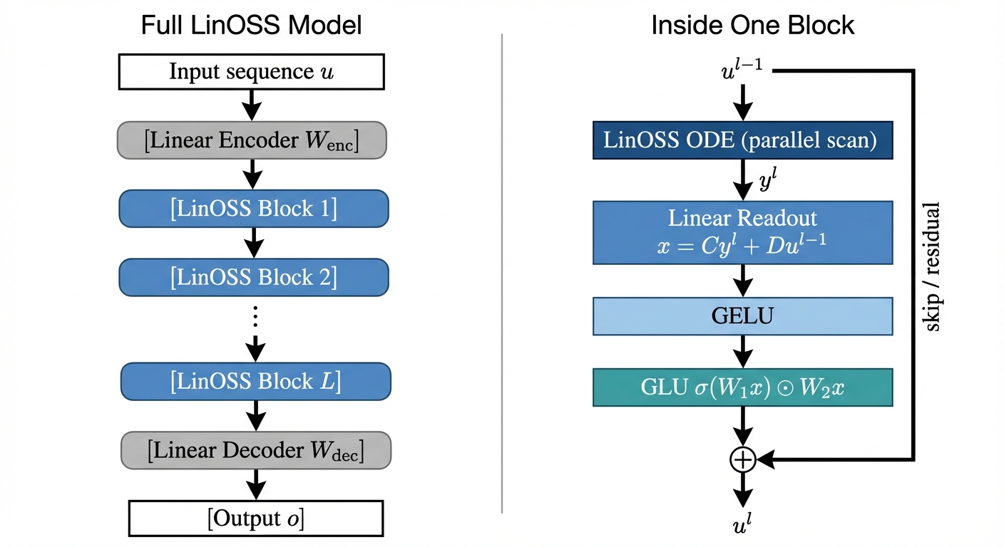 LinOSS (ICLR 2025) combined this universality proof with SSM-style parallelization. The oscillator core stays linear; expressiveness comes from the GELU+GLU layers between blocks. Physics solves the stability problem, and the universality theorem says you’re not giving up anything in terms of what the model can represent.