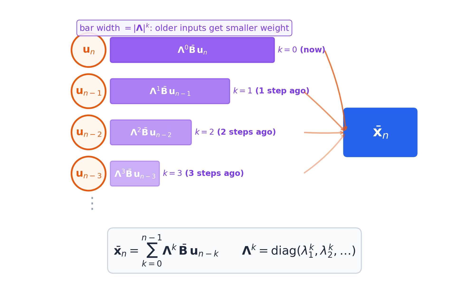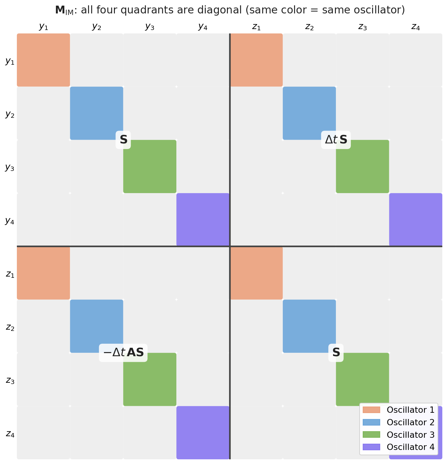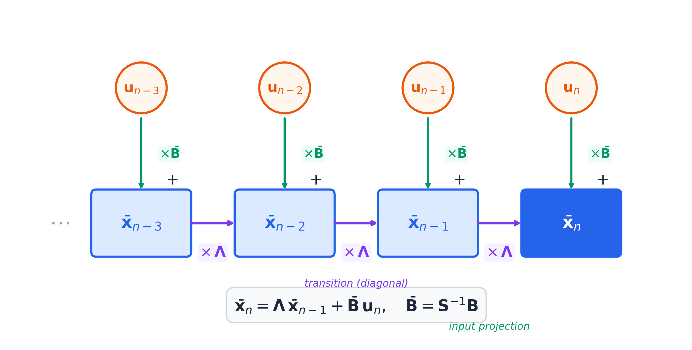 - The solution: LinOSS uses uncoupled harmonic oscillators with one constraint (\(\mathbf{A}\) diagonal, nonnegative) to guarantee stability by construction