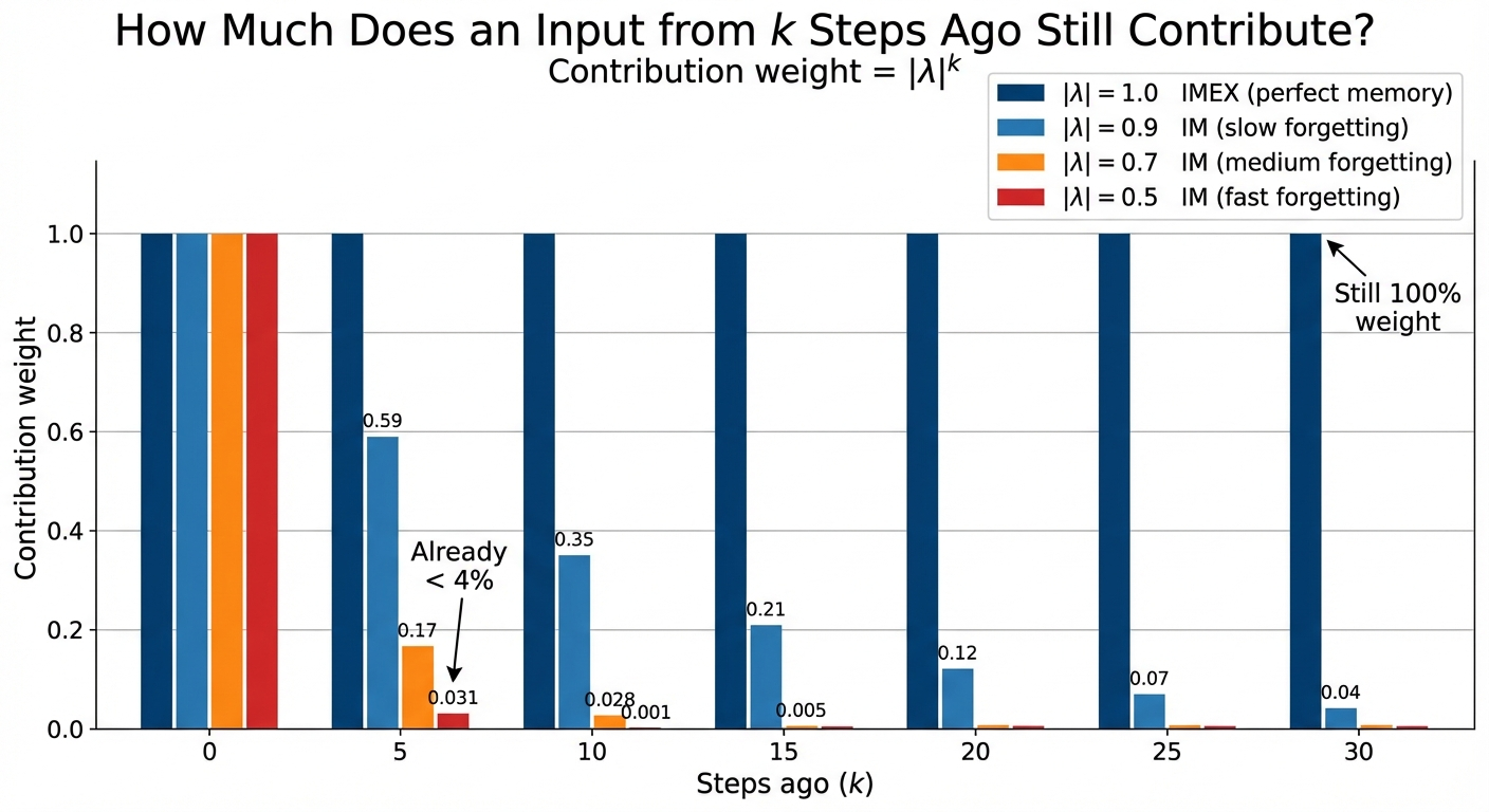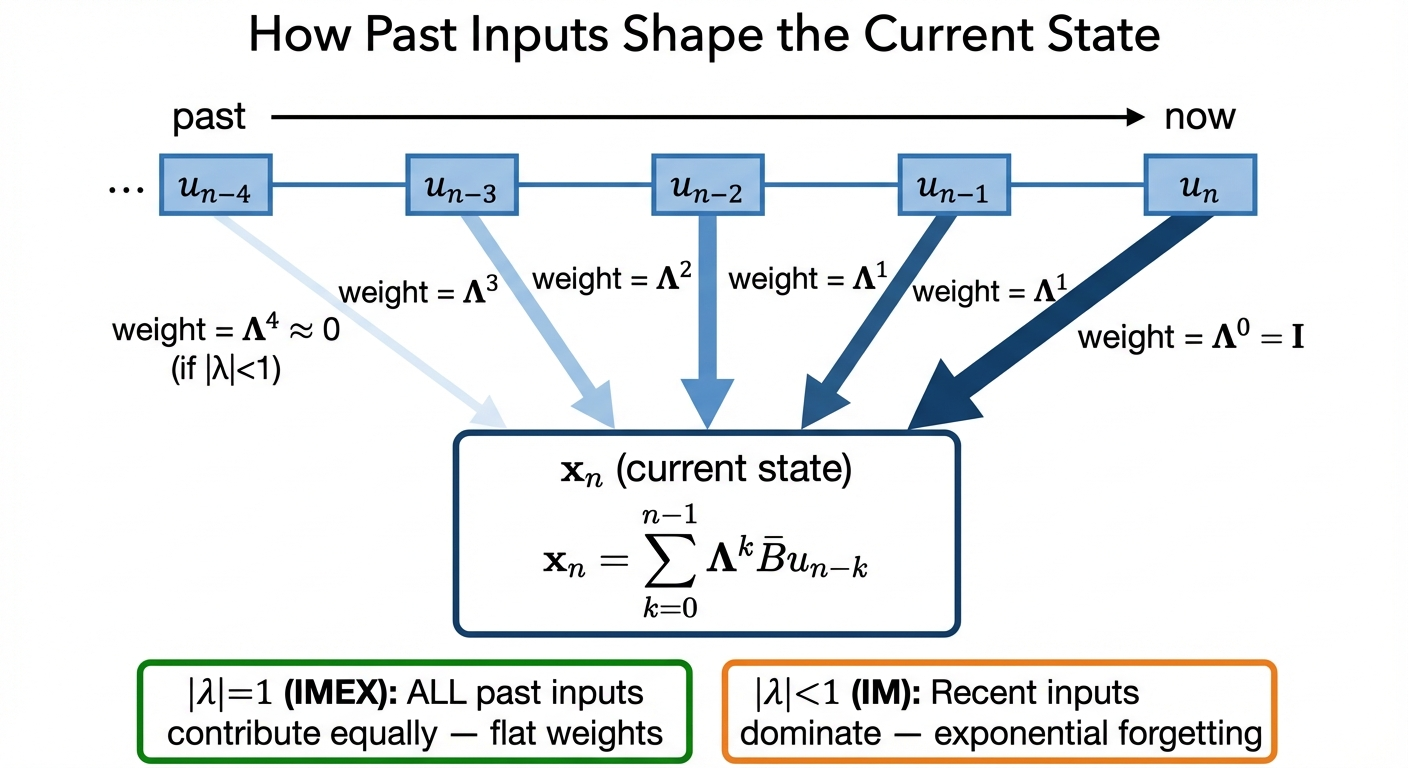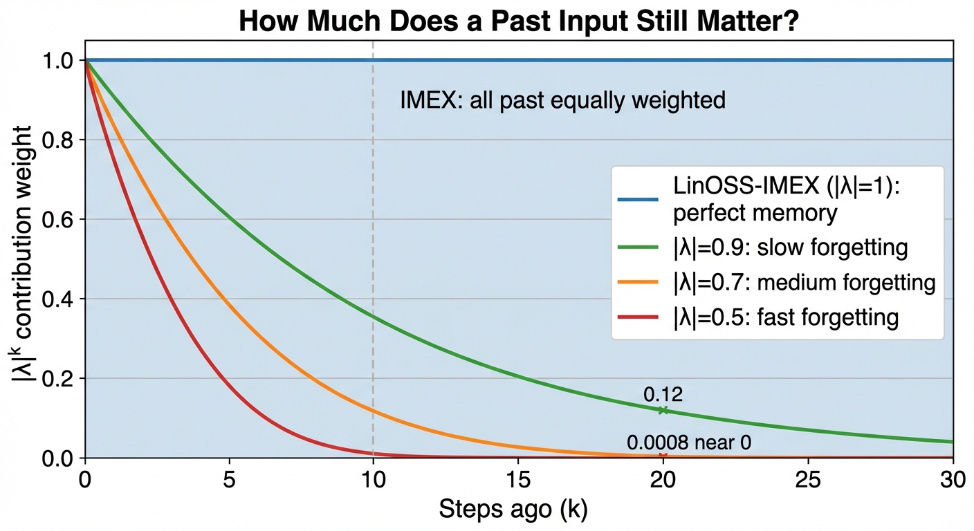 LinOSS-IMEX has \(|\lambda|=1\) (no forgetting) which sounds ideal. But LinOSS-IM’s slight forgetting acts as implicit regularization: the model learns to focus on the most relevant timescales and discard noise. In practice, IM consistently outperforms IMEX on benchmarks.