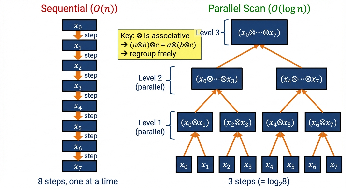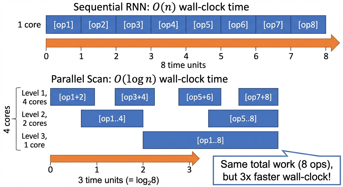 | vs sequential RNN | Same total ops, ~log₂(n) fewer serial steps |