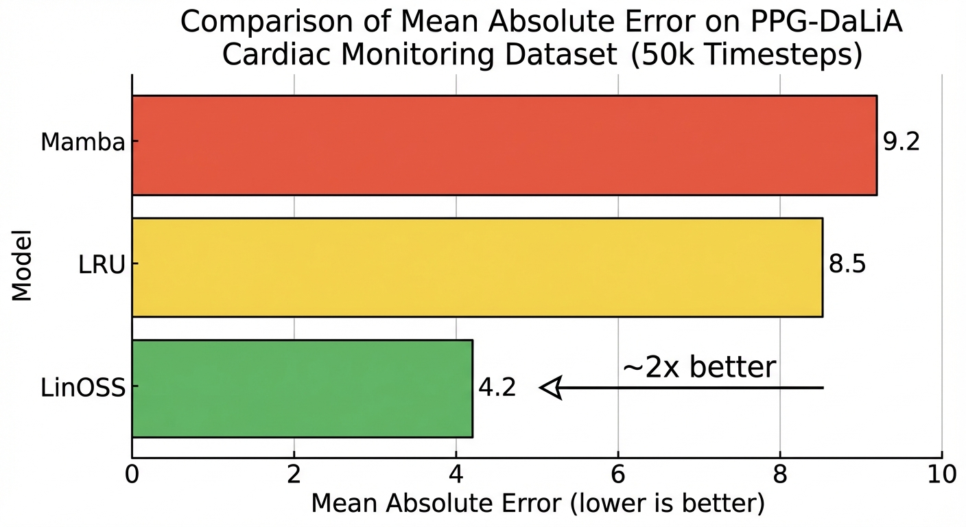 - The results: ~1.7x lower error than Mamba on 50k-step cardiac data; 95% vs 87.8% on EigenWorms vs LRU (best prior SSM)