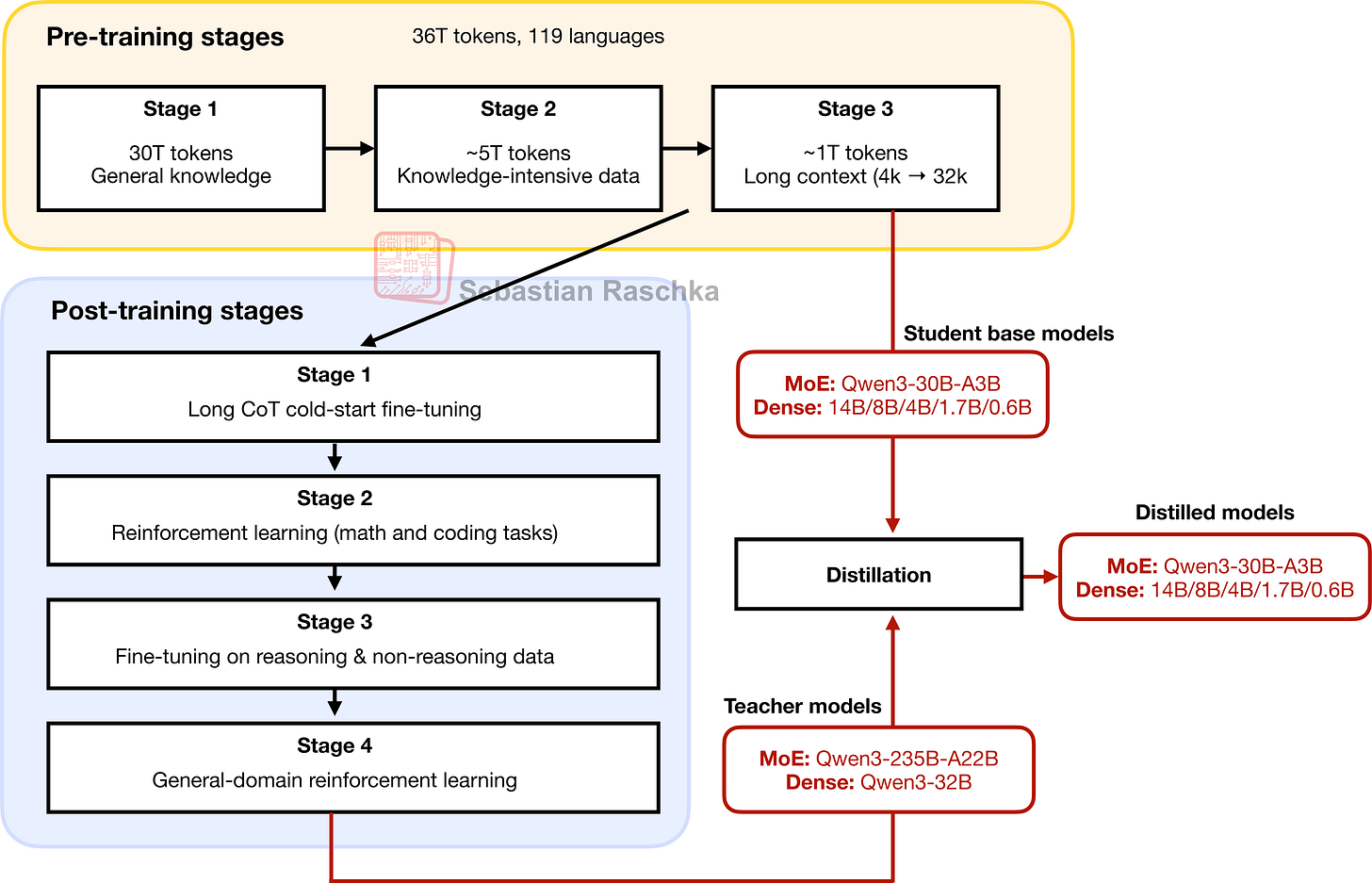 According to the Qwen3 technical report, the pre- and post-training consists of several stages each, which I summarized in Figure 5 below.
