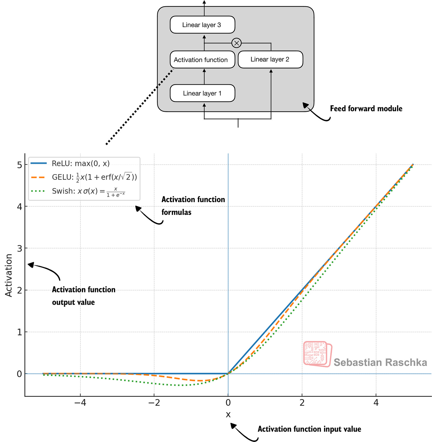 - Caption: Figure 12: Different activation functions that can be used in a feed forward module (neural network). GELU and SiLU (Swish) offer smooth alternatives to ReLU, which has a sharp kink at input zero.
