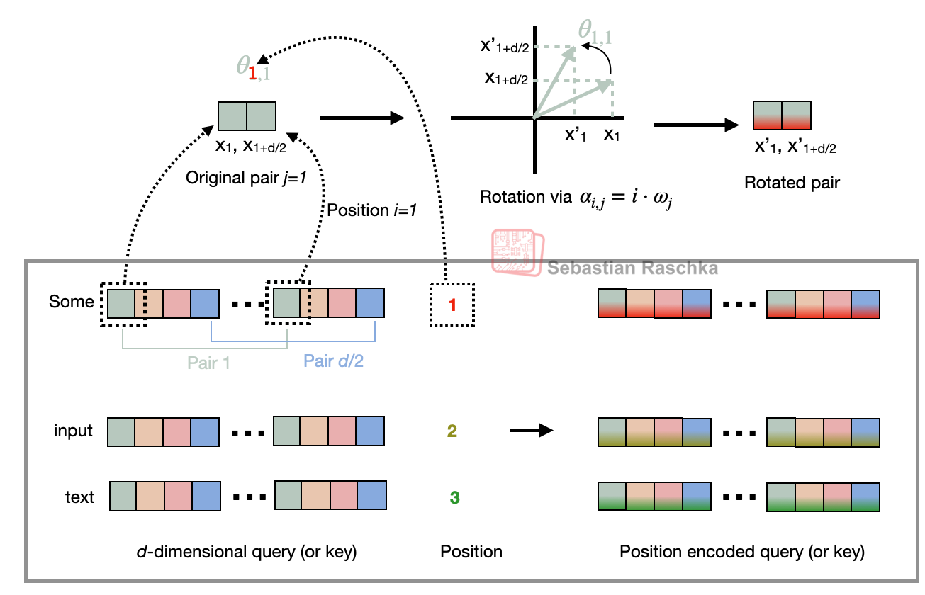 - Caption: Figure 13: Illustration of the RoPE two-halves variant. Here, it shows how a position pair in the query (or key) vector is rotated via a rotation angle α_{i,j}, which is based on a position i and a frequency constant ω_j. The figure is inspired by Figure 1 in the original RoPE paper.