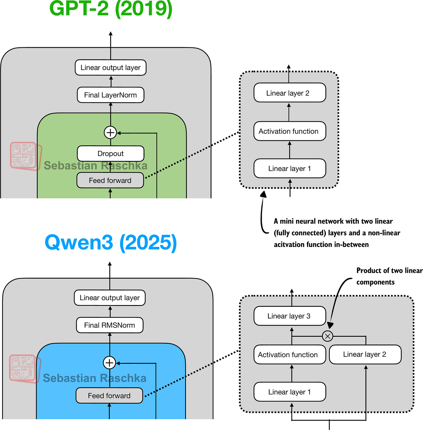 - Caption: Figure 11: In GPT-2 (top), the feed forward module consists of two fully connected (linear) layers separated by a non-linear activation function. In Qwen3 (bottom), this module is replaced with a gated linear unit (GLU) variant, which adds a third linear layer and multiplies its output elementwise with the activated output of the second linear layer.