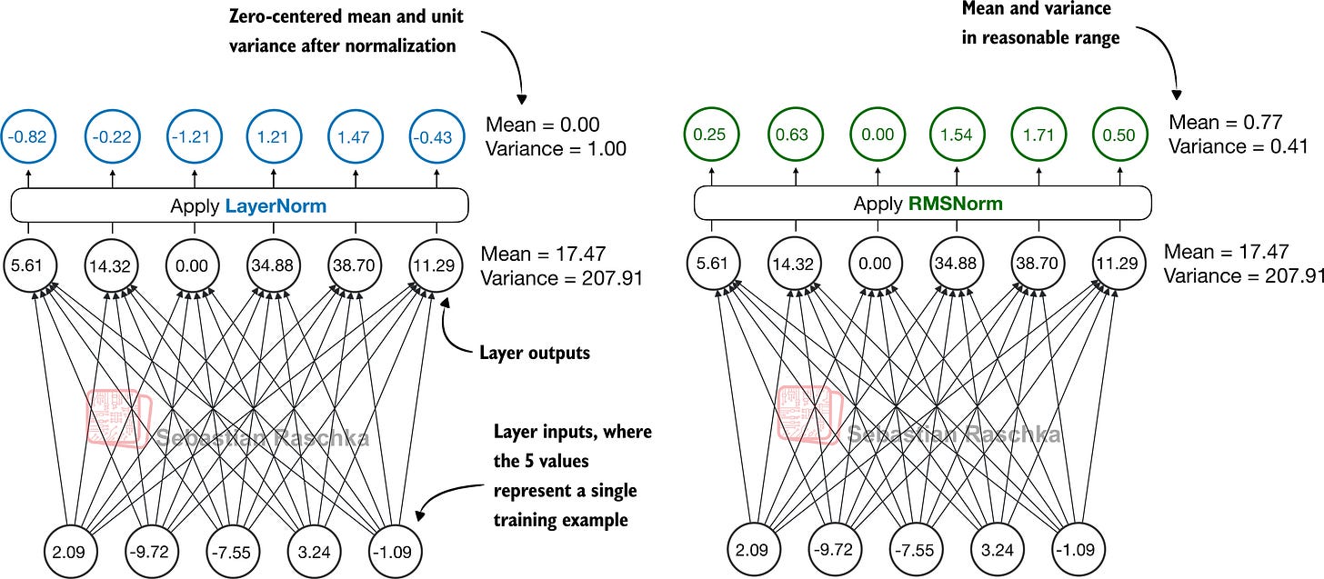 - Caption: Figure 10: Comparison of LayerNorm and RMSNorm. LayerNorm (left) normalizes activations so that their average value (mean) is exactly zero and their spread (variance) is exactly one. RMSNorm (right) instead scales activations based on their root mean square, which does not enforce zero mean or unit variance, but still keeps the mean and variance within a reasonable range for stable training.