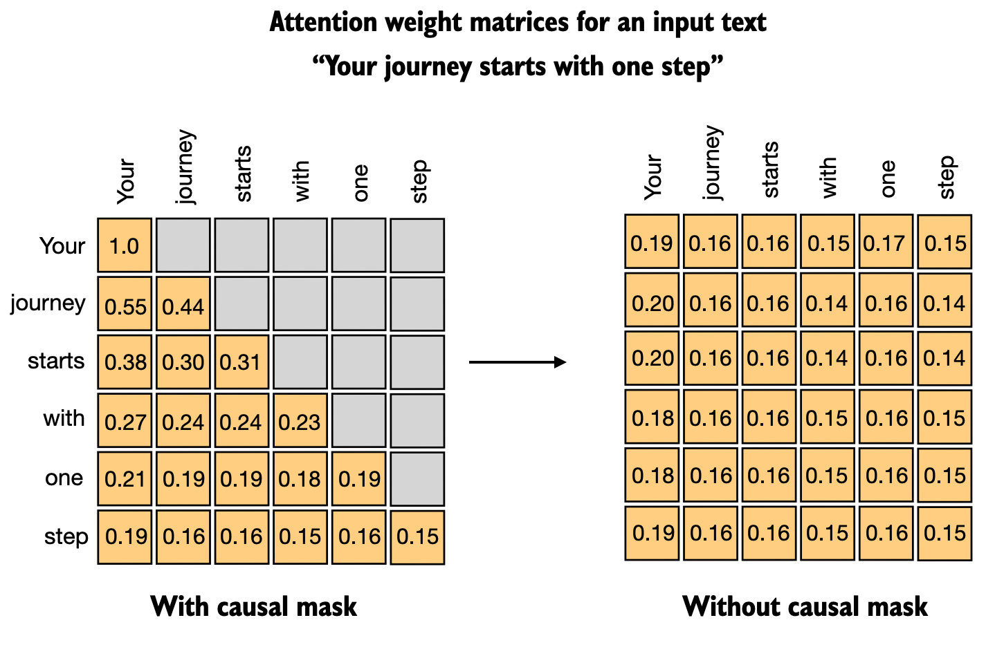 - Caption: Attention weight matrix with and without a causal mask.