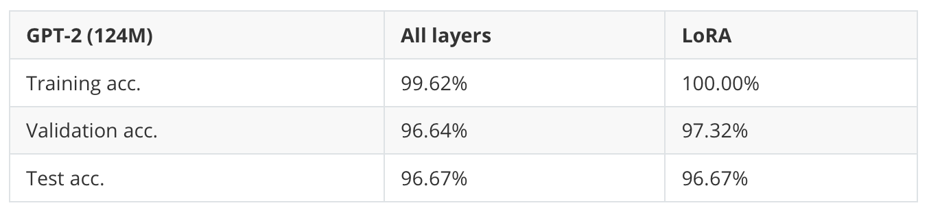 As we can see in Table 7 above, both full finetuning (all layers) and LoRA result in the same test set performance on this dataset.