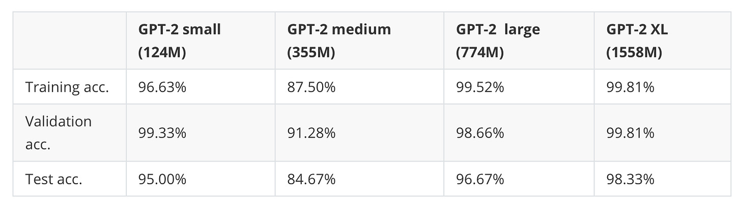 However, while the GPT-2 XL model shows a noticeably better classification accuracy than the smallest model, it also took 7x longer to finetune.