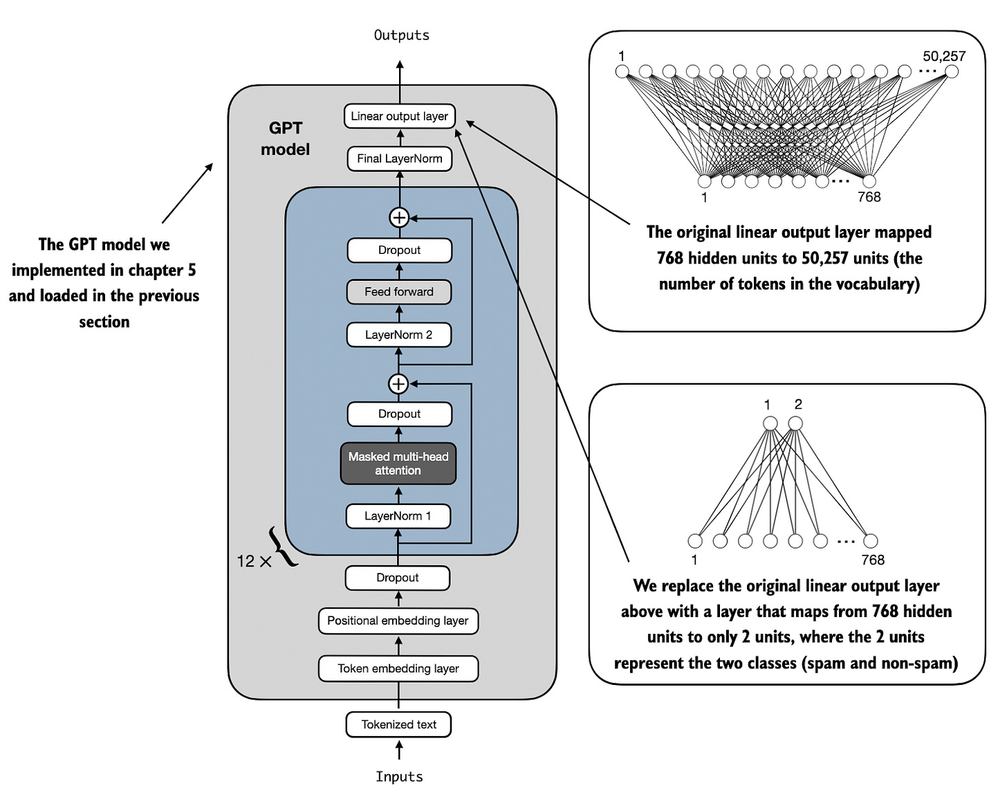 Figure - Caption: Figure 4: This figure illustrates adapting a GPT model for spam classification by altering its architecture. Initially, the model’s linear output layer mapped 768 hidden units to a vocabulary of 50,257 tokens. For spam detection, this layer is replaced with a new output layer that maps the same 768 hidden units to just two classes, representing “spam” and “not spam.”