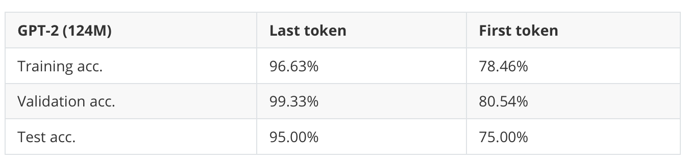 Below is additional experimental evidence, where we can see that using the first token to finetune a GPT model for classification results in a much worse performance.