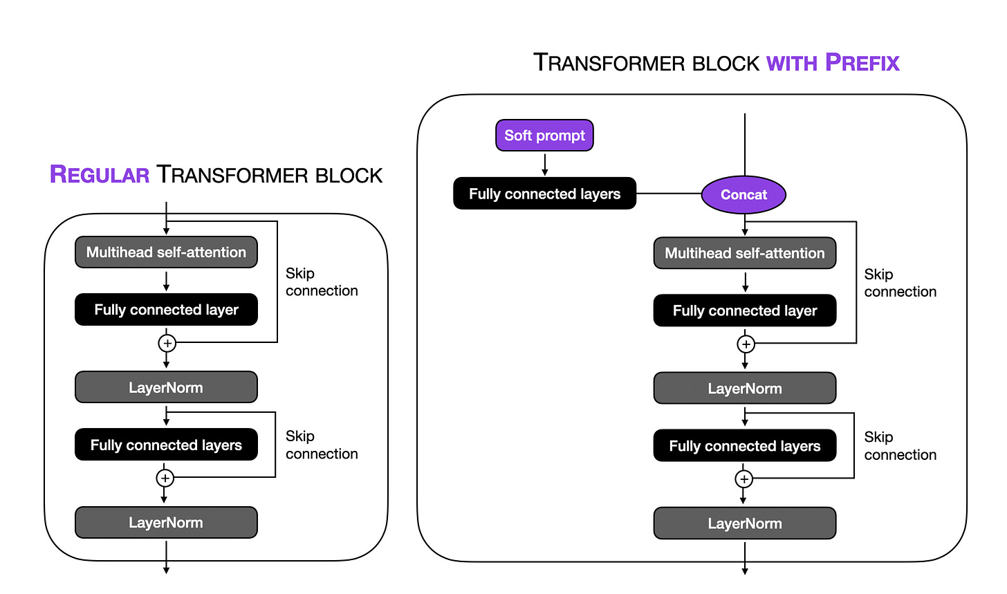 Using (Python) pseudo-code, we can illustrate the difference between a regular transformer block and a prefix-modified transformer block as follows: